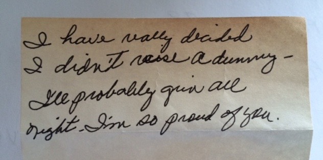 When I first started speaking to various groups/companies/associations across the country, Mother always said, “I would love to hear you speak.” I was usually in some part of the United States, far away from where she lived. But on one occasion, I was going to be nearby, so I asked if she would like to attend the conference to hear me “do my thing.” She was so excited! The day arrived and she rode with me to the conference. I got her a good seat so she could see her daughter “in action.” Conference representatives made the necessary announcements, introduced me as the speaker, and I began my presentation. Every time I looked at her face, she was grinning from ear to ear, and watching the people around her, listening to me. She wrote this note during the presentation, and gave it to me before she left to go home…a note that I will also keep for the rest of my life… Later in life, as Alzheimer’s devoured her mind and body, she would continue to ask me about my presentations, and if “they” liked me. And, as always, upon my affirmative answer, she would say with such pride…”that’s MY baby…”